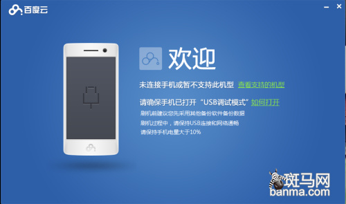 百度雲Rom的特意為系統制作的刷機功能具,工具本身體積較為小巧,只有10M左右。開啟百度雲刷機工具,在歡迎界面中提供了手機的正確連接方式,圖文結合,並且提供了Android 2.X和Android 4.X的選項位置提示。