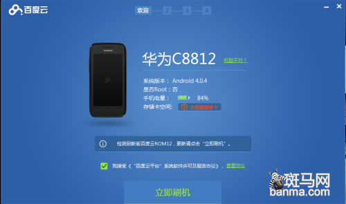 通過正確的鏈接,既可以進入手機狀態信息界面,其中提供了手機的型號、系統版本、電量以及存儲卡空間。點擊立即刷機既可以開始刷入百度雲。