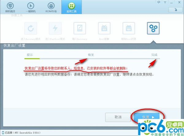 這個得借助一個軟件,刷機精靈,在使用工具欄裡面有一個恢復出廠的功能