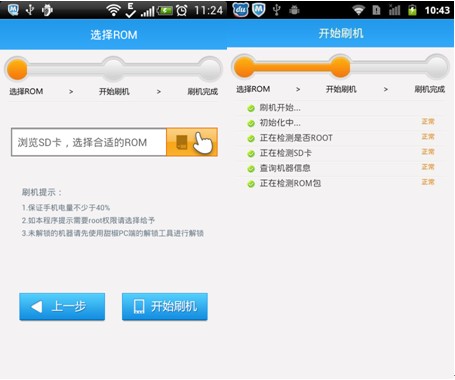 點擊“自助刷機”按鈕後,手機會進入刷機頁面,根據下圖展示,點擊SD卡的圖標,直接進入SD卡中查找SD卡中已有的ROM包,選中要刷的ROM包,直接下一步,正式開始刷機: