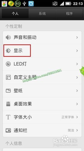 按下defy手機下方的menu鍵,進入“系統設置”,在出現的新界面中切換到“個人”選項卡,然後點擊其下的“顯示”按鈕。
