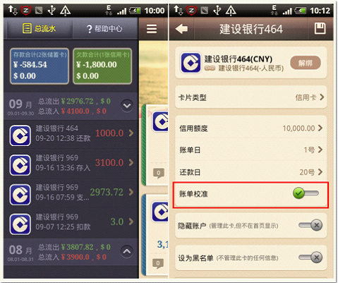 輕點卡片即可詳細查詢當期消費、本期應還款和總消費的流水明細,進入該卡片的賬戶管理頁,可根據需要手動設置卡片類型、信用額度、賬單日、還款日、賬單校准、卡片類型等系列信息。若不想顯示該卡片信息還可以設置解綁、隱藏賬戶或者設為黑名單。用戶擁有豐富的權限按照自己的個性需求來進行選擇。