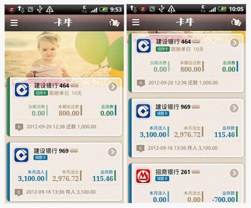 在卡牛裡,每張卡的信息都集成顯示在卡片狀的菜單欄。儲蓄卡顯示本月流入、本月流出、總存款三項信息,及最近一筆資金動態提示。信用卡顯示當前消費、本期應還款、總消費三項信息,並且還有還款日和最新消費提醒。主界面輕輕滑動即可浏覽每張卡的信息。