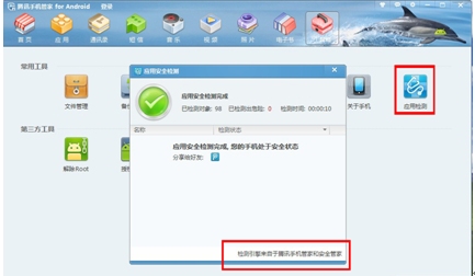 此外,在騰訊手機管家PC版工具箱中,用戶還可以找到“應用檢測”工具。該工具的檢測引擎來自於騰訊手機管家和安全管家,通過雙重的雲端病毒庫安全檢測保障,避免用戶手機遭受手機病毒等不安全因素帶來的損失。