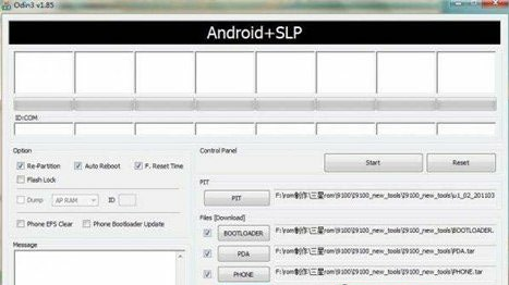 2. 手機選刷機模式連接電腦,按Start開刷,等提示刷機失敗或Odin3-v1.85卡住不動了,這時不要動Odin3-v1.85刷機軟件,手機直接拔掉數據線,拿掉電池再安裝然後開機,手機出現電話和電腦連線的圖標,這時手機插上數據線,Odin3-v1.85會提示連接手機,然後再按Start開刷,這樣就能重新刷機了。