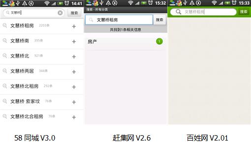 在三款應用上使用搜索功能時,58同城無線客戶端3.0版本的搜索功能和google一樣可以進行詞語聯想,在筆者輸入“文慧橋”後,能快速聯想出“文慧橋租房”、“文慧橋南”、“文慧橋兩居”等關鍵詞,還顯示了相關信息條數,非常強大。
