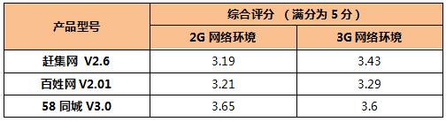 趕集V2.6與58同城V3.0在移動2G/3G環境下的性能綜合評分如下: