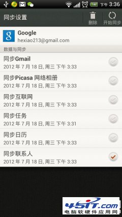 這時屏幕中會出現很多的選項,我們只要點擊剛剛設置好的Google賬戶就可以了,選擇完畢後,手機中會彈出一個長長的選項欄,我們在這裡找到最下方的同步聯系人,將其勾選中,然後再點擊屏幕最上方的開始同步,就一切都搞定了。