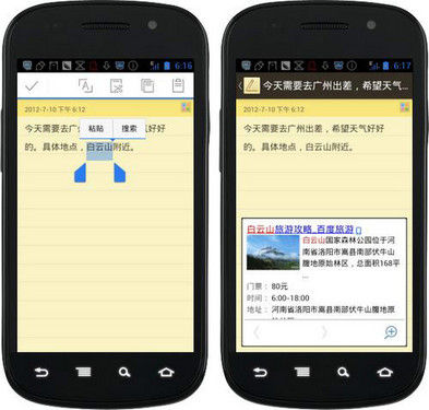 作為百度旗下產品,當然要以搜索見長。新版百度雲ROM就是將分詞技術與搜索半屏框相結合,系統能夠自動識別用戶選定的文本,同時半屏搜索框在當前屏幕直接顯示搜索結果,用戶無需中斷當前的操作就可以完成搜索。