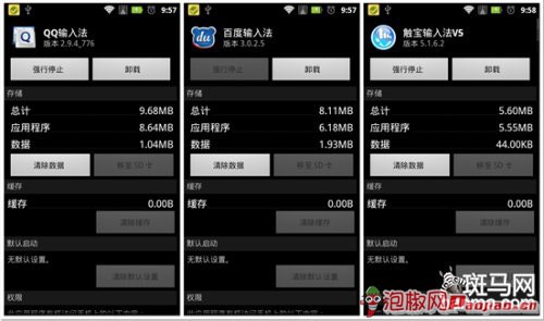 從下圖的占用空間來對比,觸寶的體積最小,但由於觸寶采用了組件化的結構,原始安裝包中只有最基本的拼音和英文,要用手寫、五筆等輸入方式則需要另外下載插件包。所以只能說觸寶在這裡做的比較巧。不過需要用戶二次下載的行為或多或少會影響用戶的使用體驗。