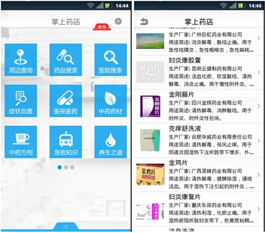 父親漸漸老去,偶爾生病也很正常。當父親需要找某藥品的說明書或者想去藥店買藥去醫院看病時,“掌上藥店”就能發揮大作用了。掌上藥店能提供上萬種藥品的詳細信息(說明書)和周邊藥店或醫院地址。