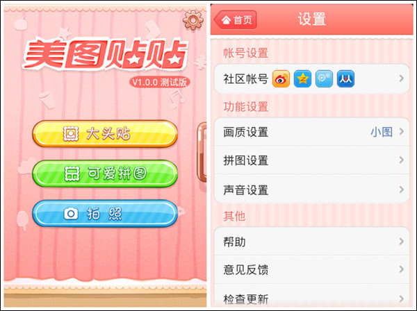 “美圖貼貼”功能主要分為制作大頭貼和可愛拼圖。首次使用可以點擊軟件首頁右上角齒輪設置按鈕進行相關設置。