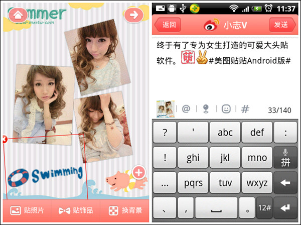 眾多的可愛素材和便捷的操作體驗讓小編玩的意猶未盡,但是文章要結束還是先做個總結再慢慢玩,哈!其實美圖貼貼與其姊妹軟美圖秀秀同屬圖片處理軟件,但是貼貼更傾向於女生用戶群,完全粉可愛的風格帶來無與倫比的清新感,專注大頭貼、拼圖常用圖片功能的制作,相信喜歡拍照和分享的親,一定不能錯過這款免費的可愛軟件哦!