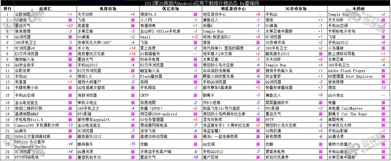 2012年第20周國內Android應用下載應用榜共包含安卓市場在內的十二家第三方應用商店數據,榜單總結如下:應用匯和木螞蟻更新最多,360創新低;微信羽翼漸豐,超越QQ有望;墨跡天氣本周成績傲人;高清水果消失,中國水果上位;不會飛的小鳥才是最永恆的主題。