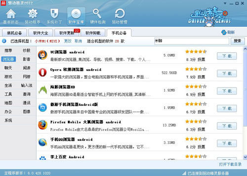 第一天的新鮮勁還沒過,手機提示電量不足,索性直接將小米手機插到電腦上充電時,正在運行的驅動精靈主動彈出提示,為小米手機安裝了相應的驅動。我隨手打開驅動精靈浏覽,卻意外發現它的軟件寶庫中還提供智能手機裝機必備的軟件。