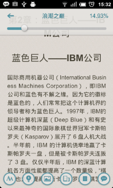 5.圖書閱讀支持字體縮放、背景更換(比如有的人喜歡淺藍,有人喜歡淺綠,淺黃等等)、橫豎屏切換、夜間模式與白天模式切換,亮度調整等功能,智能目錄解析讓你看書不再雜亂無章;如下圖: