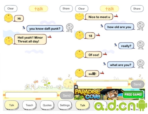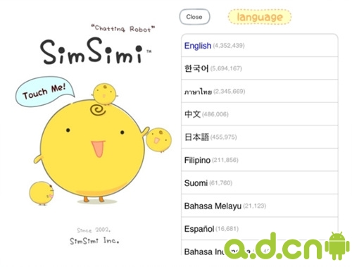 SimSimi 這只小雞其實是個智能計算機,能夠和用戶「談話」。第一次進入時,單擊小雞,同意條款後便可以選擇你的語言。這個並不是界面的語言,而是你希望用甚麼語言和小雞談。如果選了英文,又和小雞說中文,它便不能回答。