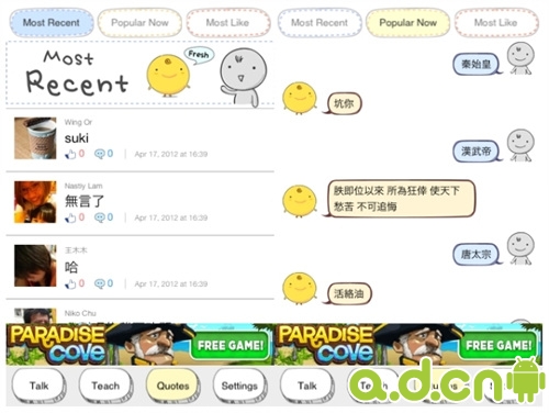 如果和小雞談話的內容十分有趣,可以在對話框的右上角按 Share 分享出來。而 Quote 的一項就是別人分享了的對話,分別有最近、最熱門和最多 Like。這裡的例子都十分有趣。