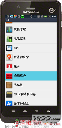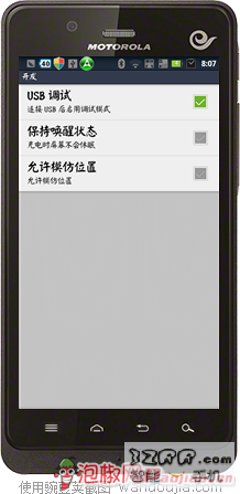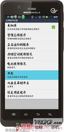 3 打開手機端的開發模式。按menu(手機下端四大天王鍵之最左邊那個像“三”一樣的鍵)~設置~應用程序~開發,在這裡把USB 調試勾選上。