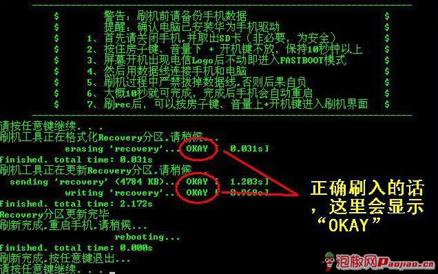 5. 運行第一步解壓縮後的文件夾裡面的 “雙擊刷入Recovery.bat”, 開始刷Recovery,大概10秒左右就刷完了。