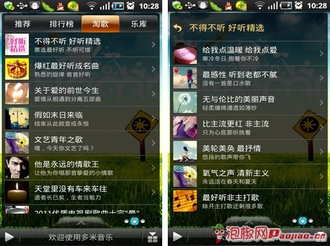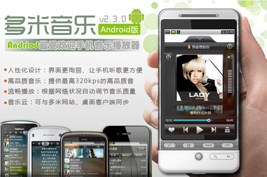 與Andriod平台其它的手機音樂播放器比較而言,多米音樂在UI設計上絕對是最好的,沒有之一。不可否認,像天天動聽、QQ音樂等,在UI設計上做的也非常不錯,但相對於多米音樂而言就少了一分靈動。多米音樂清新靈動的界面設計,是其大受歡迎非常重要的原因之一。