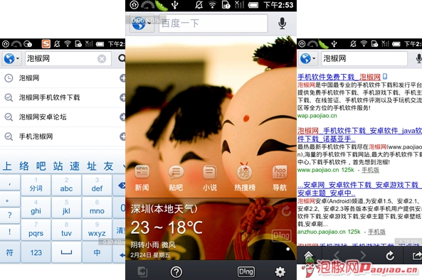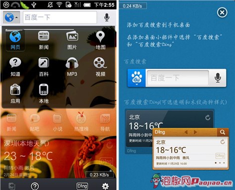 可以看到,百度搜索手機客戶端的功能還是非常強大的,比如切換搜索分類、添加各種Ding、首頁天氣顯示等,這些在傳統的手機浏覽器上登入百度是享受不到的。