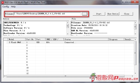 2)將手機插上數據線與電腦相連,打開RSD,選擇剛剛下載的對應底包(底包在上面以給出鏈接,請選擇相應BL的2.2 底包刷入),然後點擊start開始刷機。刷機期間千萬不要斷開數據線,也不要關閉RSD。刷底包過程中手機會自動重啟,請耐心等待。當RSD中顯示 PASS,就可以關閉 RSD了。