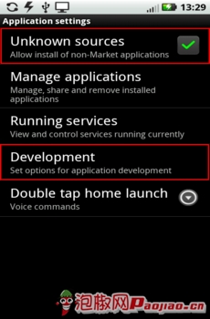 3)待手機重新啟動之後進入設置,依次勾選允許安裝未知源和USB調試功能,如果刷入的底包是英文系統親參照下圖的方法操作:點小綠人再一路skip,進行跳過。出現桌面後按菜單鍵,選擇Settings–Applications,將Unknow sources勾上,再進入Development,將USB debugging勾上。
