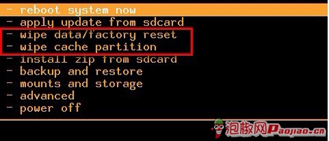 6)刷機之前記得備份,因為你的存儲在手機中的資料會被抹除。重啟手機會自動進入Bootmenu(不會自動進入的同學請在重啟時LED藍燈亮起按下音量下鍵),在這裡音量加減鍵控制上下,電源鍵為確認。 進入Recovery,選擇Custom Recovery,首先wipe cache partition”,完成後再 wipe data/factory reset。wipe執行完成之後選擇install zip from sdcard。