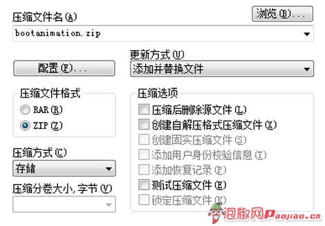 2).最後一步是壓縮成名為bootanimation.zip的壓縮文件,要注意:壓縮格式必須是.zip, 還有最重要的是,壓縮方式必須選擇為“存儲”否則系統讀不到的。完成,可以替換原有開機動畫啦!