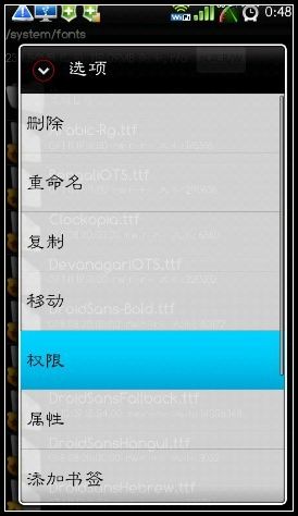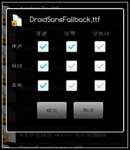 字體已經復制進系統的字體文件夾(fonts)裡,但並不是就大功告成,接下來才是關鍵的,就是長按剛才復制進去的字體文件,彈出的權限要修改,不然會顯示全部口口的哦。