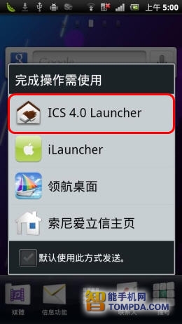 首先,仿制最主要的就是桌面了,小編為大家推薦的就是冰淇淋桌面。小編我在試用完這個桌面後,對它的印象還是蠻不錯的。無論是操作的流暢度和仿制的逼真程度都還算不錯的,在下載軟件之後按下HOME鍵選擇ICS桌面,即可應用安卓4.0系統的桌面了。