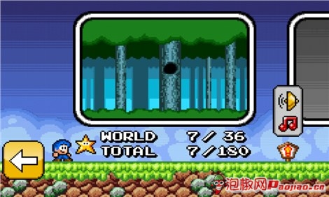 游戲的主界面比較簡單,點擊中間的“play”就可以開始我們的冒險了,畫面的又下角有個小燈,點擊後是設置音效及音樂的,畫面很像素化,主要是為了讓我們有懷舊的感覺。游戲中一共有5大關,每個大關又分12個小關,我們需要通過完一個大關以後再能進入下一個大關,游戲中沒有難度選擇。