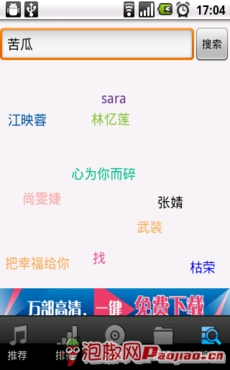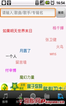 小編我是使用泡椒軟件筐下載安裝的這款悠友易搜歌軟件的。打開軟件,首先默認進入的是易搜歌的搜索頁面。所以可以看出這款軟件最主要的功能就是提供歌曲搜索服務。搜索頁面設計還挺特別的,除了上方有一個搜索框,下面還顯示著很多個五顏六色的歌名和歌手名。而且這些歌名和歌手名還會在一定時間內隨機更換顯示。