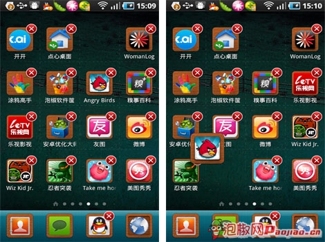 簡單的編輯模式也可以算得上是QQ桌面的一大亮點了,按住圖標不動系統就會自動進入編輯模式。在編輯模式下,椒友們可以隨意拖動圖標,點擊圖標右上方面的X還可以直接刪除軟件在桌面上顯示。