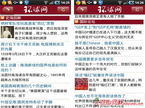 在環球時報主界面上,椒友們可以用手指向下滑動,還有依次排有要聞、深度報道、軍事、環球財經、娛樂和體育、新聞背景、環球掃描、關注中國、異國風情、史海回眸、國際論壇、台港澳傳真幾大頻道。