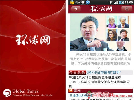 點擊進入環球時報,軟件的界面是以紅色為主,在視覺上給人一種喜慶的感覺。經過幾秒的跳轉後,進入環球時報的主界面,在界面頂部有張大圖顯示,這就是本期時報的頭條了!