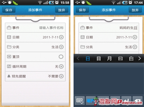 為了使椒友們能更好更全面的了解易提醒,小編來給大伙做個示范!首先,椒友們先來給事件取個標題,比如“媽媽的生日”然後再選擇日期跟分類。
