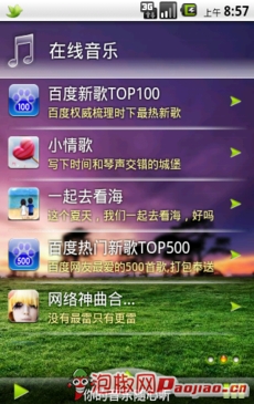 然後真正進入悠友軟件界面。首先來到的是在線音樂模塊,軟件界面的背景圖片是一副綠色草地的野外照片。軟件中的所有頁面都是以這個為背景,小編也找不到可以更換皮膚的相關設置。但是小編就喜歡這種讓人置身於大自然的清爽感覺的皮膚。不知椒友們感覺如何~~