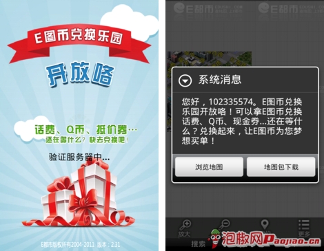 打開E都市三維地圖,加載頁面上顯示了它當下正在進行的活動。然後出現一個系統消息提示框。從消息中可以看到E都市地圖自動為每部手機設定一個ID號。下面有兩個按鈕,用戶可以選擇直接浏覽地圖,也可以先進行地圖包下載再浏覽。(其實直接浏覽地圖也是同時在進行下載的)