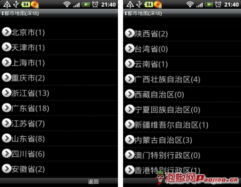 接著就讓用戶選擇地圖將要顯示的城市,在地圖選擇頁面上可以看到E都市提供的城市選擇還是挺全面的,其中還包括香港、澳門特別行政區。不過個別小城市的地圖暫時還不能在這裡找到。選擇城市後,若用戶下次需要重新選擇,可以在“菜單—>城市選擇”中重新設置。