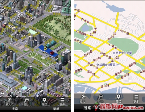選擇城市後(小編選擇的是深圳),進入地圖界面,頁面顯示的是城市最中心的區域部分。而且默認顯示的是三維版的。地圖上的街道名稱都標識得非常清楚。可以點擊放大、縮小按鈕對地圖進行縮放。當縮小到一定級別的時候,地圖就會用二維的方式進行顯示。
