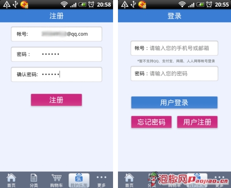 上購物網站那就必須要登錄帳號,在頁面下方的菜單欄切換到我的樂淘模塊,然後就在這裡登錄帳號,如果還沒樂淘帳號,就點擊用戶注冊進行帳號注冊,注冊過程只需填入帳號(手機號或者郵箱)和密碼,無需填很多繁瑣的內容。給用戶大大節省寶貴時間。小編我就最喜歡這種簡單的注冊方式了。呵呵。