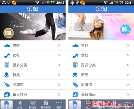 進入樂淘首頁,頁面上方是一張精品推薦圖片,左右滑動圖片可浏覽到5款不同的精品推薦。這種推薦方式在其他購物網站客戶端和視頻網客戶端也經常看到。下面是六個欄目分類。有男鞋、女鞋、新品、品牌館和每日精品等。