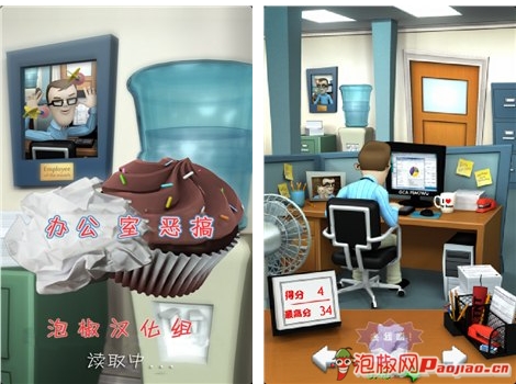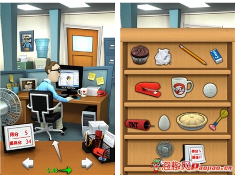 游戲的加載畫面做得非常精致,在一個飲水機旁邊飛著紙團以及蛋糕,要是不小心的話,可是會被砸一身的哦,飲水機後面還有主角扮鬼臉的照片,非常和諧的一個辦公室氣氛,開始游戲後,畫面的下面還會出現一個非常的提示“丟我呀”,主角已經迫不及待的讓你丟他了。