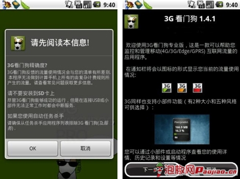 啟動軟件,首先會彈出一個類似於服務條款的對話框。點擊同意之後會出現3G看門狗的簡介與詳細基礎功能介紹,雖然對於軟件本身來說並沒有太花哨的外表。但是很容易給用戶一目了然的快感,從根本上讓用戶了解軟件的作用。