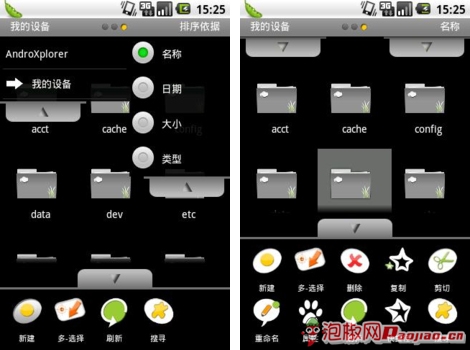 設備菜單中可以顯示當前手機系統中包含的全部文件和文件夾路徑,進入設備界面我們很容易發現在屏幕上方跟下方有三個抽屜式的導航菜單,通過選取不同的菜單就可以對文件有對應的操作。更改排列方式、新建、查看等等都是被支持的。