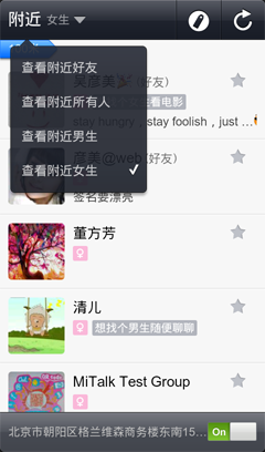 在一周的沉寂之後,米聊Android版再次迎來更新,新版本在好友名片中集成了新浪微博功能,讓你一鍵進入對方微博查看。而更多的更新則體現在米世界中,用戶不僅可以使用訊飛的語音識別技術進行語音輸入,還能在附近熱點中按性別找人。用戶可登錄www.miliao.com或直接用手機掃描二維碼免費更新使用。