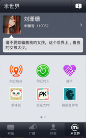 除了加強基礎功能之外,米聊不斷為用戶的溝通樂趣提供方便。在新的米世界中,校園大PK、腦筯急轉彎等眾多功能齊上線。其中,“校園大PK”為 各大高校提供了展示平台,最萌的自拍、最亂的桌面、最美的校花……豐富的校園生活從來不缺乏亮點。 僅看好友的名片,並不能十分了解對方,沒准兒Ta還有沒告訴你的小秘密寫在了微博裡。新版米聊在好友名片中集成了微博功能,您只需要點擊微博圖標即可查看 Ta最近在微博上的發言。 在查找“附近的人”時,用戶一定會有這樣的困擾:我只想找到異性朋友聊天交友,列表中出現的同性總是那麼礙眼!在米聊新版本中,查找附近的人時增加了過濾 條件,現在您可以看到整個列表充滿帥哥或全是美女的“壯觀場景”啦! 無論是群聊還是和好友單獨對話的界面,點擊右下角的“Mi”鍵即可在米世界中找到“語音輸入”功能。想輸入文字直接說就行,再也不用忍受手機打字的龜速 啦。另外,這個“語音輸入”功能還有個妙用,你可以讓米聊幫你記錄想說的話,然後將這段文字復制到微博、短信等需要使用的地方。只要有米聊,文字輸入的瓶 頸就不復存在啦。當然,你還可以測試一下自己的普通話是否標准。