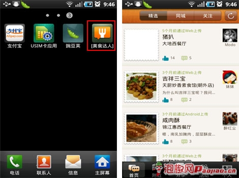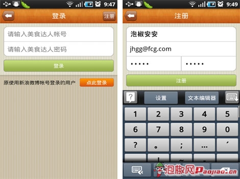 點擊LOGO進入美食達人,我們可以看到新版本與舊版本完全不同,進入後不會直接就出現登錄注冊的界面,我們完全可以在潛水的狀態去浏覽別人的美食分享,只不過,當我們想關注某位食客或者是某家餐館時就必須注冊登錄了。椒友們是不是覺得這樣有點麻煩,其實小編覺得一點都不麻煩,我們不僅可以使用美食達人帳號登錄,還能直接使用新浪微博帳號登錄,如果兩個帳號都沒有,還可以直接在線上注冊,操作也非常簡單!
